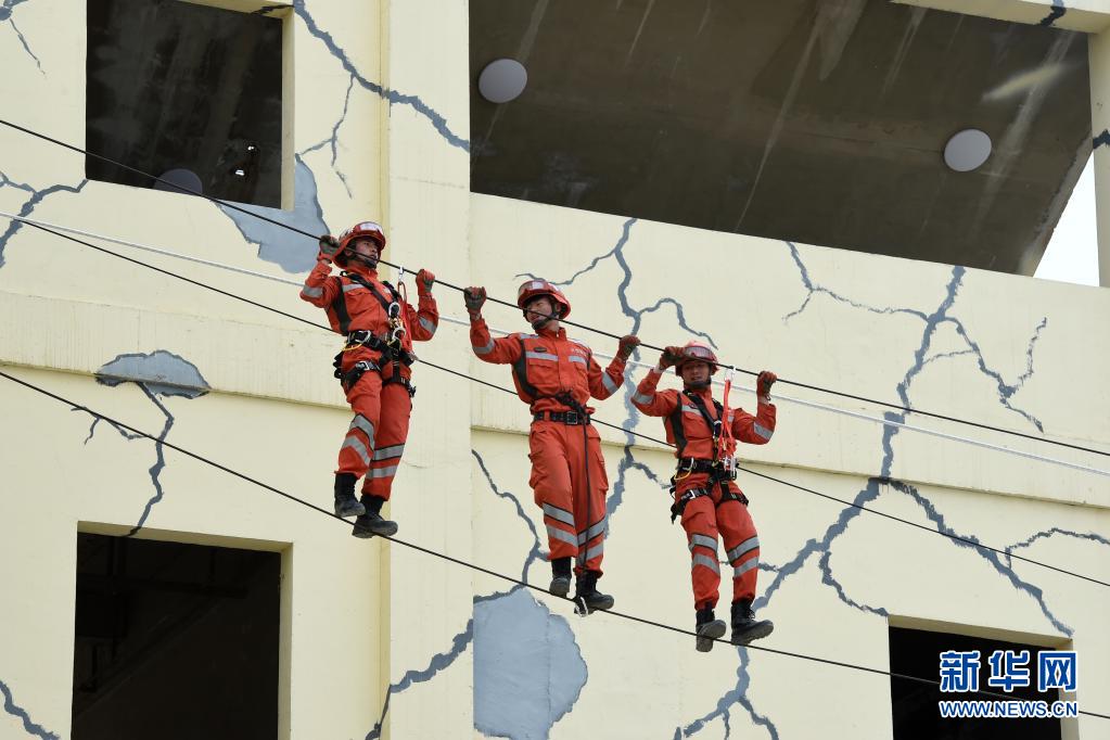 在兰州国家陆地搜寻与救护基地,武警甘肃总队机动支队战士进行绳索救援技术训练(5月10日摄)。