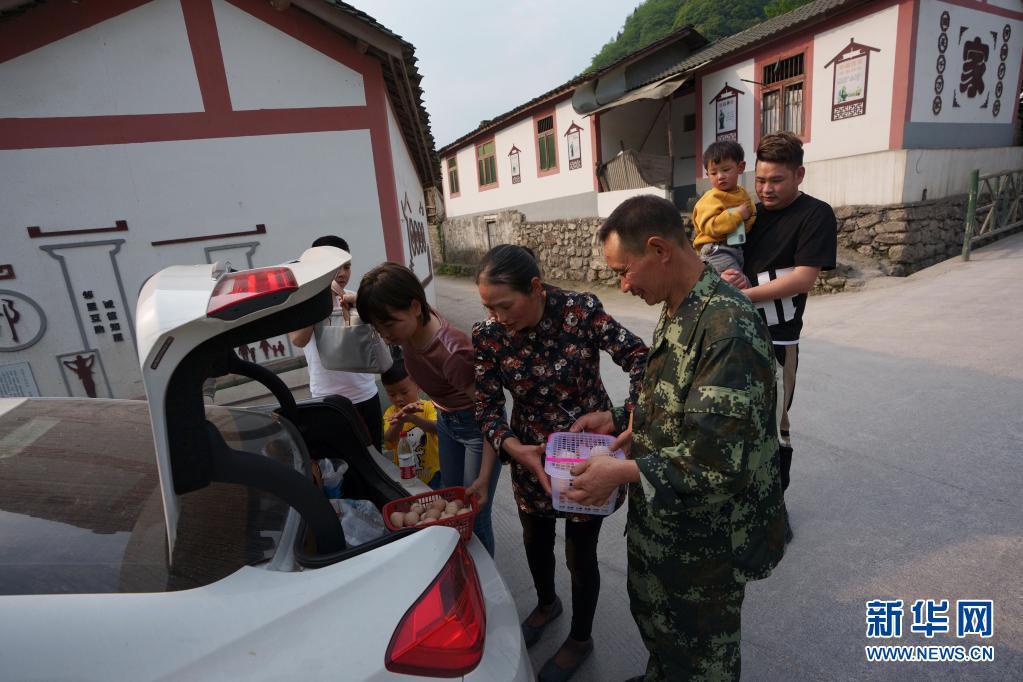 5月4日,女儿林苓一家准备返程时,林兴聪、李芸香夫妇给他们捎上鸡蛋。 新华社记者 江宏景 摄