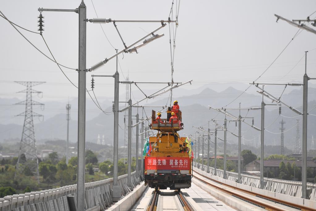 我国首条民营控股高铁——杭绍台铁路开始架设接触线。新华社记者 黄宗治 摄