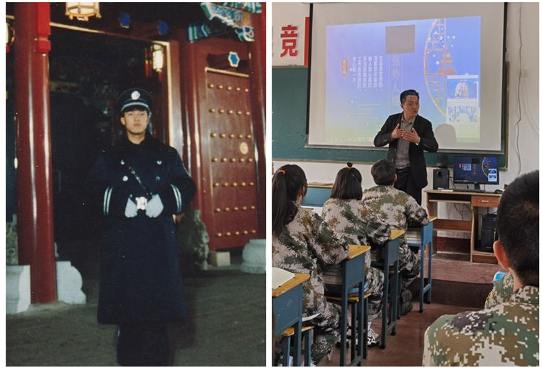 左图:张俊成在北大当保安时期。受访者供图 右图:张俊成在给学生们上课。新华社记者马晓媛摄