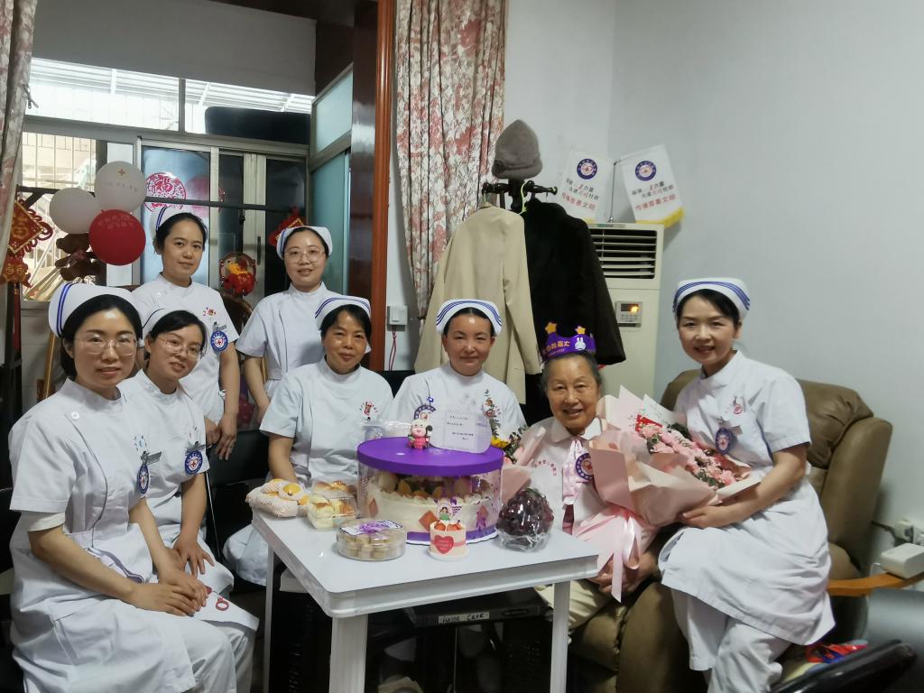 图为5月10日,章金媛老人92岁生日时,南昌市第一医院护士和老人一起庆祝生日。来源:南昌市第一医院