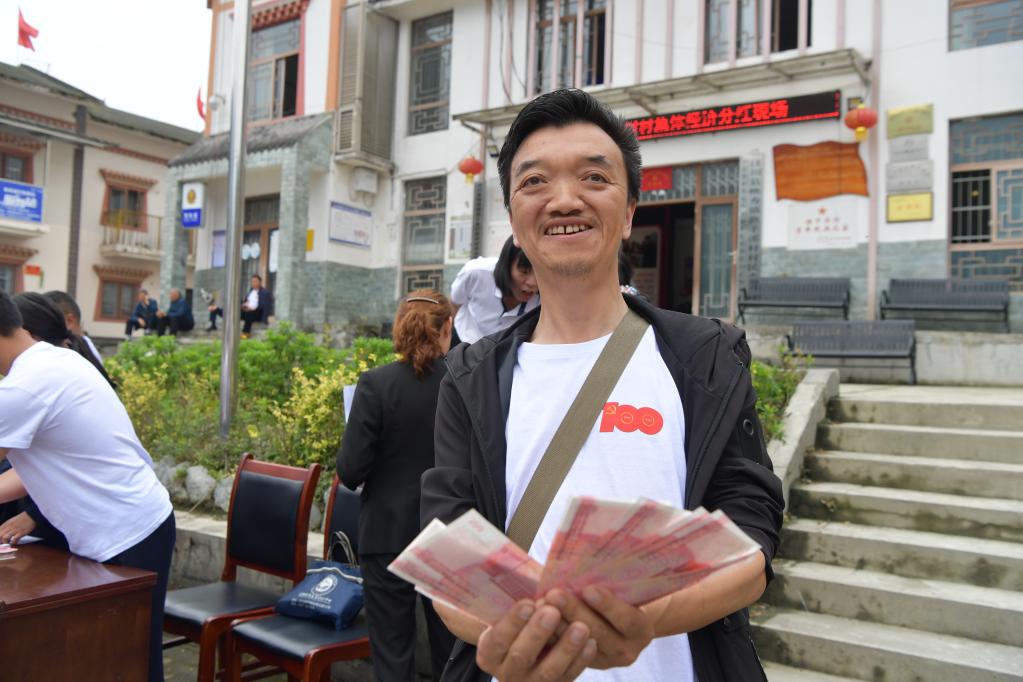 新华社成都5月12日电(记者谢佼)“又分红啦!”5月12日上午10点,映秀镇渔子溪村活动中心摆着3张条桌,31万元的现金当天要全部发放给渔子溪村1017名村民。在四川省阿坝藏族羌族自治州汶川县,这已成为这个昔日的地震灾区从废墟变身爱国主义教育基地的生动写照。