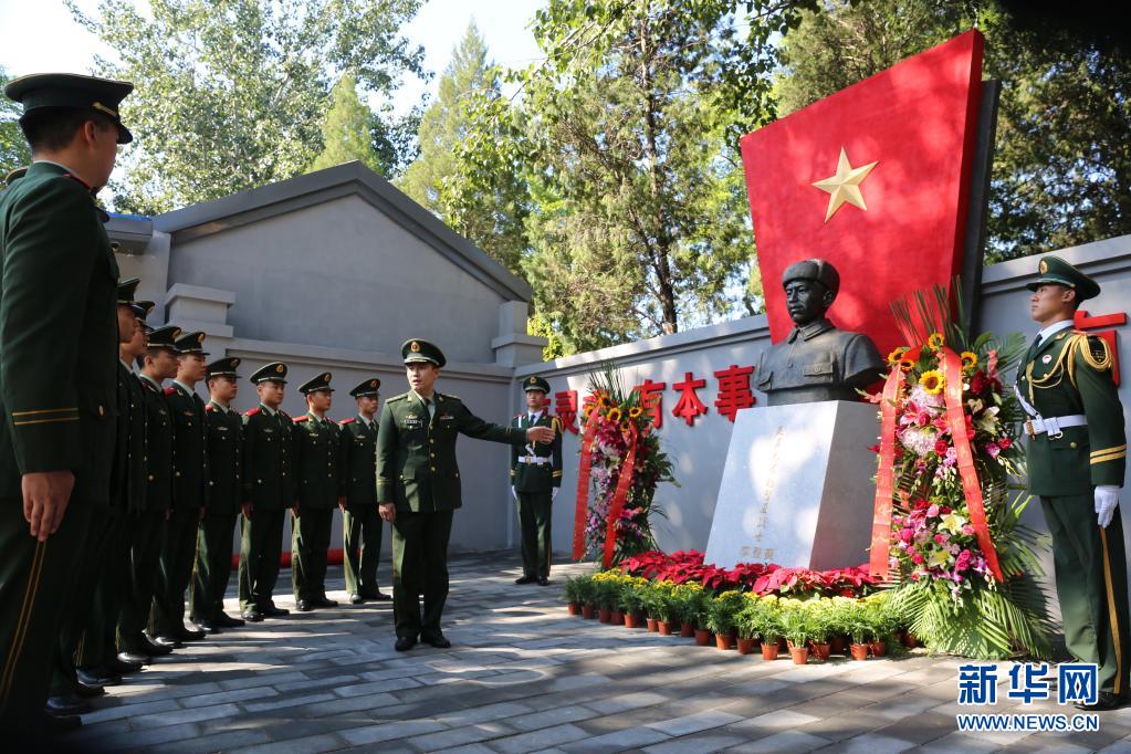 武警北京总队执勤九支队官兵在李登贵烈士雕像前举行纪念活动(2016年9月8日摄)。新华社发(武炎龙 摄)