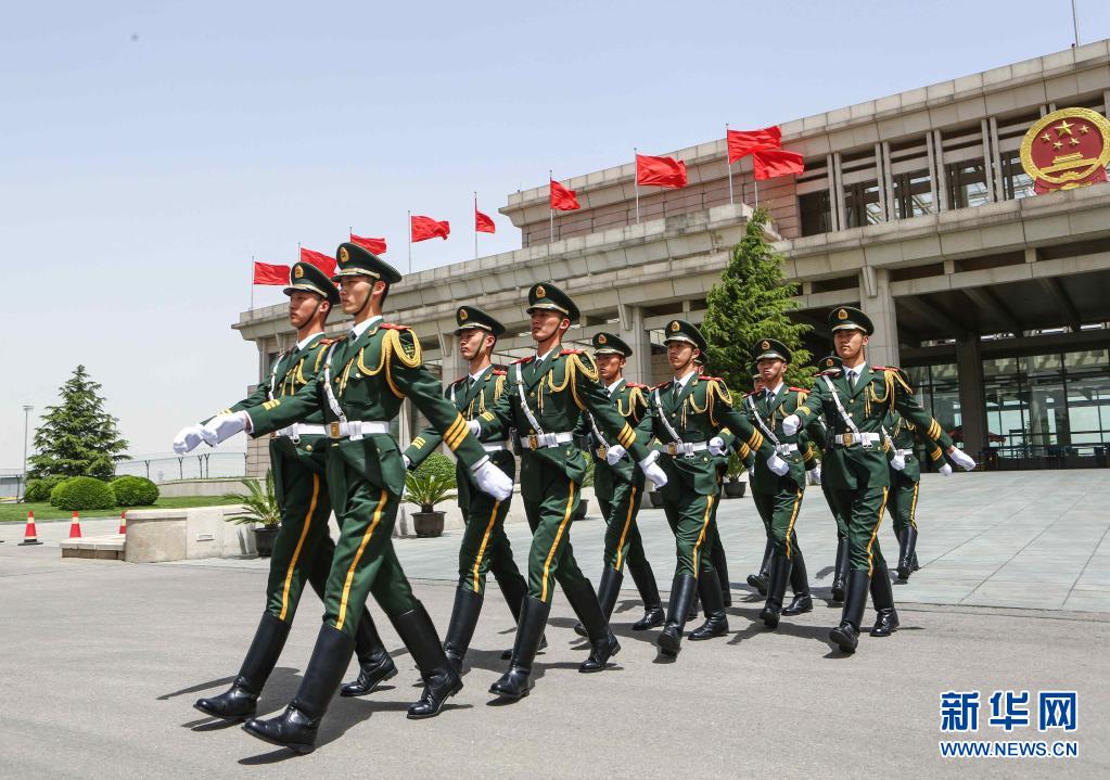 武警北京总队执勤十一支队仪仗礼兵在首都机场国门前走向执勤哨位 (2017年5月11日摄)。新华社发(魏威 摄)
