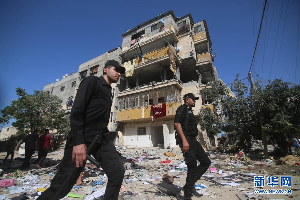5月12日,巴勒斯坦警察在加沙地带南部汗尤尼斯查看以色列空袭造成的破坏情况。新华社发(哈利德·奥马尔摄)
