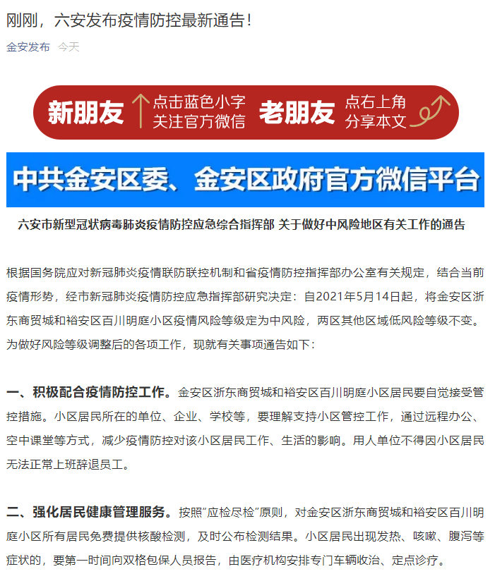 根据国务院应对新冠肺炎疫情联防联控机制和省疫情防控指挥部办公室有关规定,结合当前疫情形势,经市新冠肺炎疫情防控应急指挥部研究决定:自2021年5月14日起,将金安区浙东商贸城和裕安区百川明庭小区疫情风险等级定为中风险,两区其他区域低风险等级不变。为做好风险等级调整后的各项工作,现就有关事项通告如下: