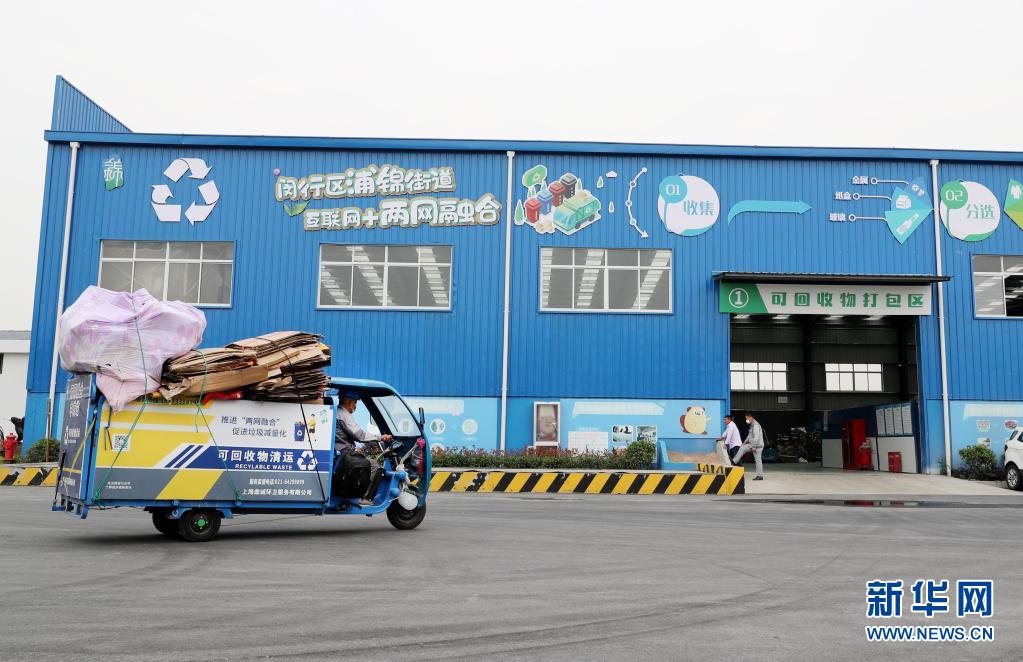 一辆可回收物清运车驶入上海闵行区浦锦街道的“两网融合”中转服务站(2020年5月27日摄)。新华社记者 方喆 摄