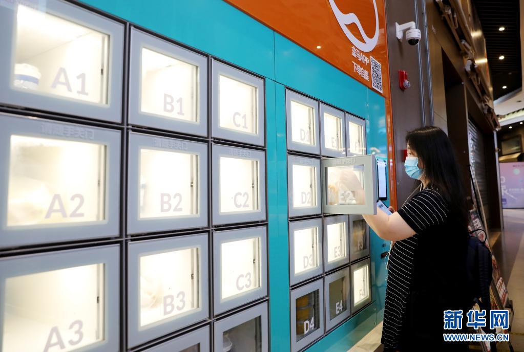 一位顾客通过APP扫码,在上海地铁13号线世博会博物馆地铁站附近的一家盒小马服务点取餐柜中拿取预定的早餐(2020年7月17日摄)。新华社记者 方喆 摄