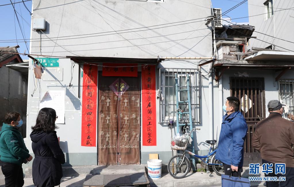 在上海杨浦区一处旧改动迁小区,几位居民被一户人家门前贴出的对联吸引(2020年12月9日摄)。新华社记者 方喆 摄