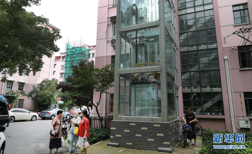 2018年6月28日,社区居民们走出新安装的电梯。当日,上海黄浦区五里桥街道恭房小区5、6号楼加装电梯工程顺利竣工,居民多年来上下楼困难的问题得以解决。新华社记者 方喆 摄