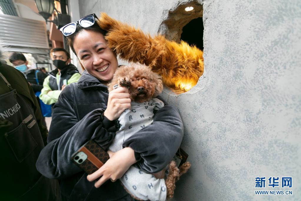 上海永康路上有个“网红”熊爪咖啡,店长和店员都是听障人士。客户点单后,店员会从墙洞里伸出一只萌萌的熊爪,为客户递上一杯温暖的咖啡。这是一名顾客与伸出洞口的“熊爪”互动(2020年12月4日摄)。新华社记者 王翔 摄