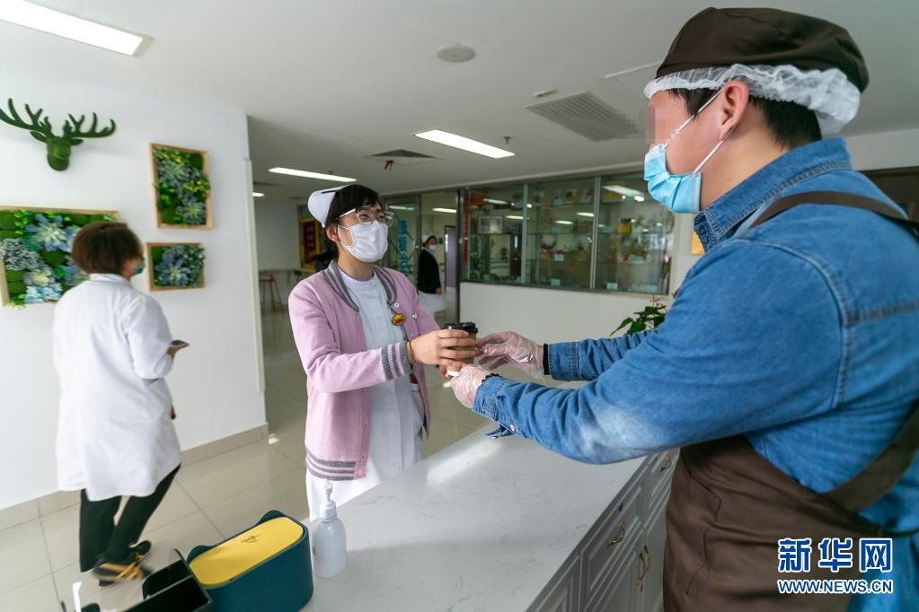 在上海市杨浦区精神卫生中心开了一家名叫“Healing Coffee”的咖啡店,三名已出院的患者轮流担任调制咖啡、收银、结算的工作。咖啡店为卫生中心的工作人员提供咖啡等饮品。这是见习咖啡师沐枝为医护人员送上制作好的咖啡(2020年12月3日摄)。新华社记者 王翔 摄