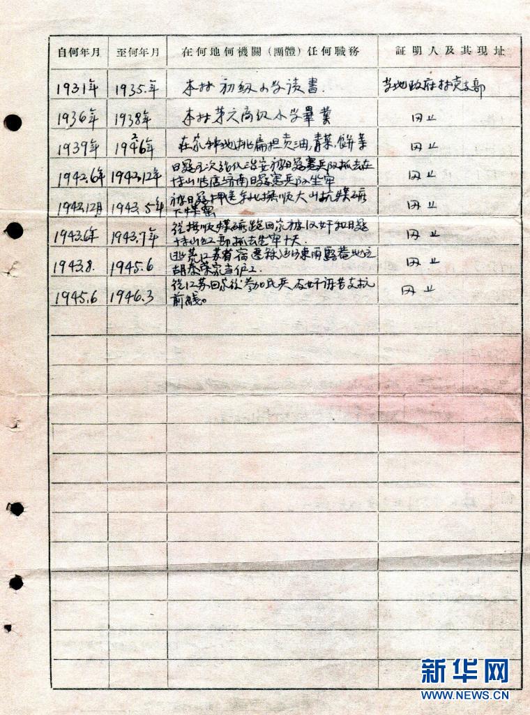 这是焦裕禄来到大连起重机器厂后,亲笔书写的履历表(资料照片)。新华社发(大连博物馆供图)