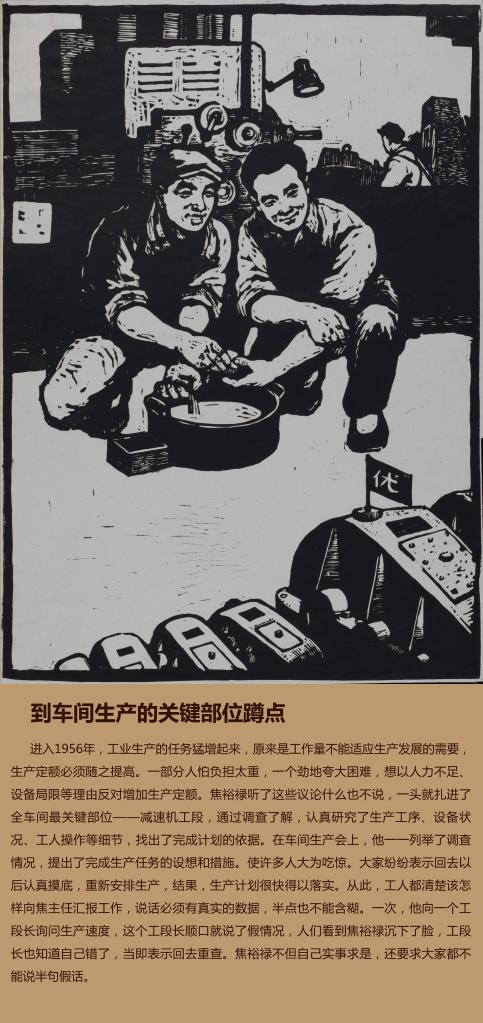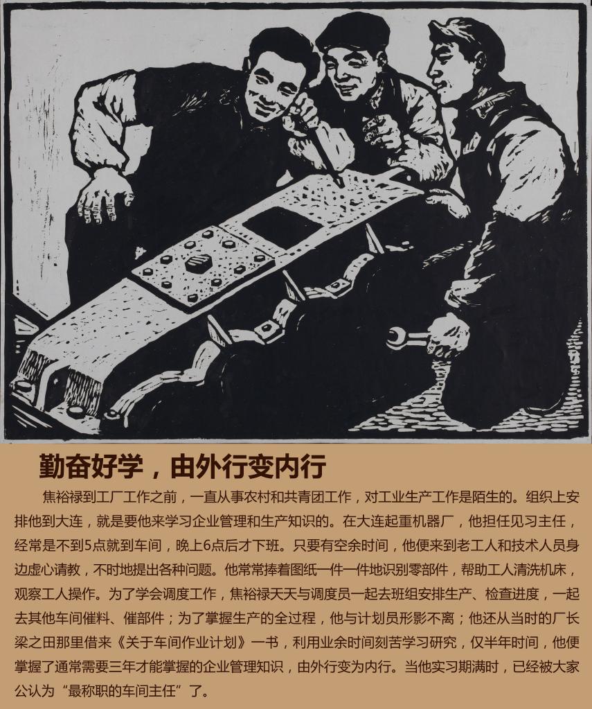 这份现存于大连博物馆的履历表,两位健在的亲历者,14幅半个世纪前工人自发创作的木版画,将时空拉回至1955年3月至1956年底的大连,拼出焦裕禄鲜为人知的大连故事,讲述他在大连起重机器厂工作的日子:从“门外汉”到“最棒车间主任”,把办公室搬到车间,给夜班女工看孩子……
