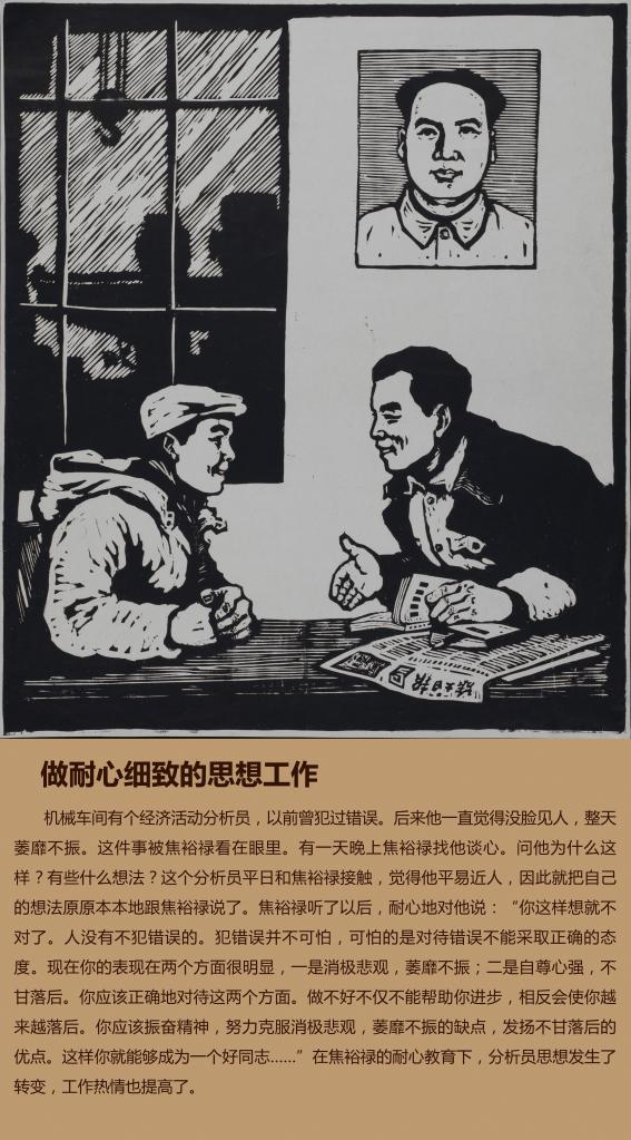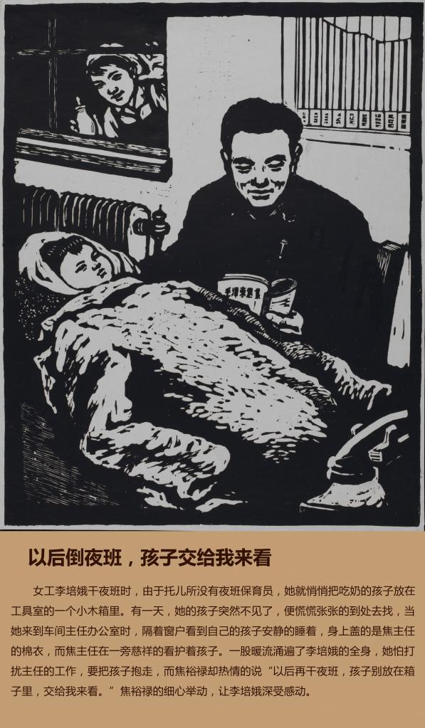 孩子身上盖着焦裕禄的棉衣,睡在焦裕禄的办公桌上,焦裕禄则在旁边看书学习,孩子母亲的笑脸映在窗口。这张木版画,生动地再现了焦裕禄帮夜班女工看孩子的情景。毛淑兰的大女儿刘慧萍说:“我一岁多的时候,焦叔叔也抱过我。”