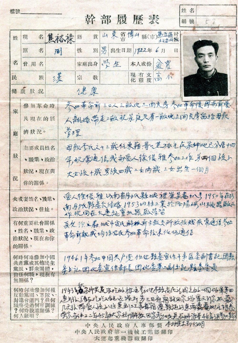 这是焦裕禄来到大连起重机器厂后,亲笔书写的履历表(资料照片)。新华社发(大连博物馆供图)