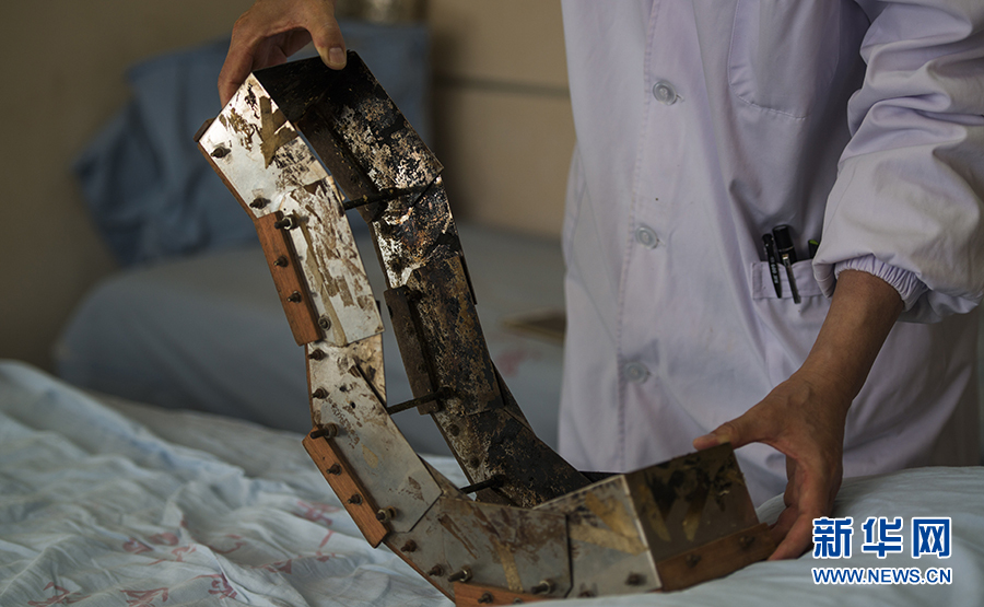 蔡圣朝展示自己发明的“通脉温阳灸器”(5月8日摄)。
