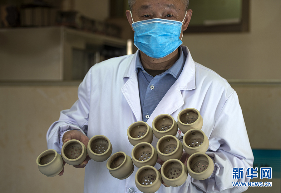 蔡圣朝展示自己发明的“阳光普照灸器”(5月8日摄)。