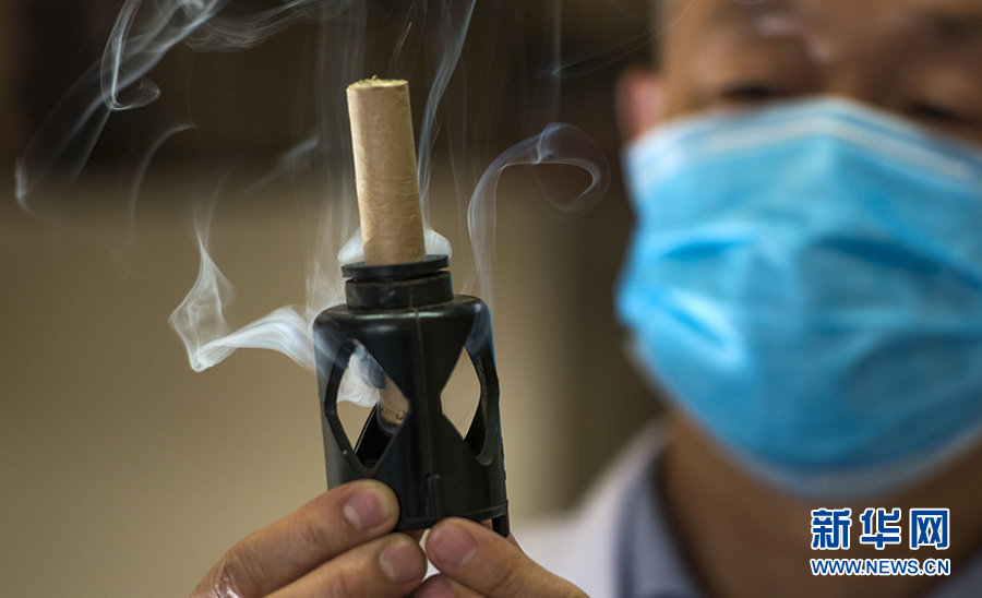 蔡圣朝展示周楣声老师发明的“八卦灸架”(5月8日摄)。