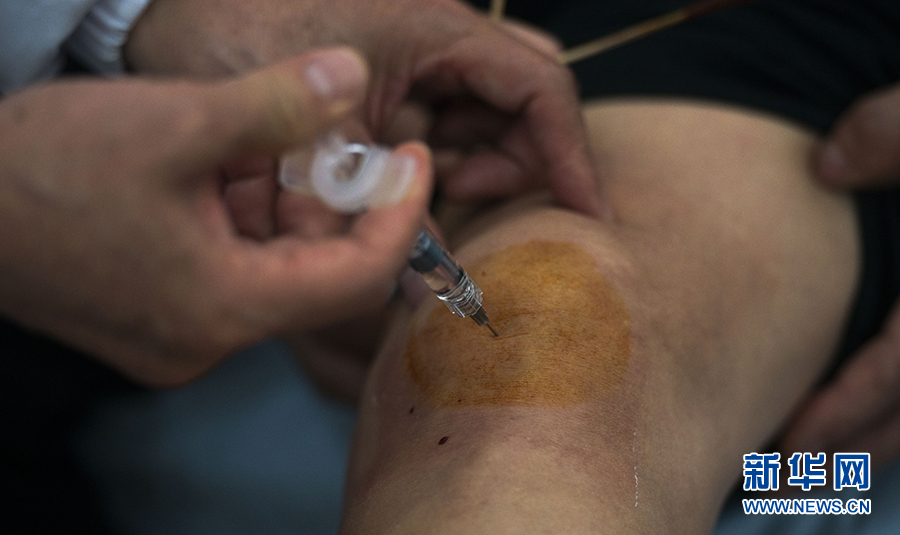 蔡圣朝为病人进行穴位注射(5月7日摄)。