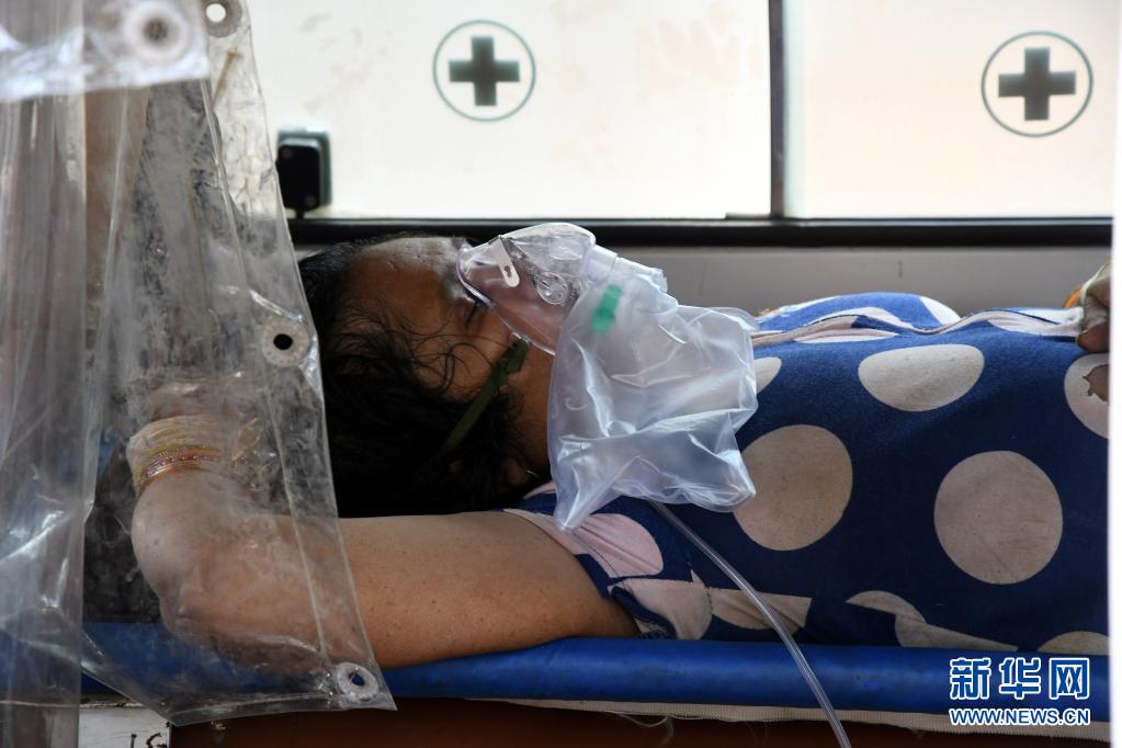 5月13日,一名新冠病人在印度巴特那一所医院外吸氧。