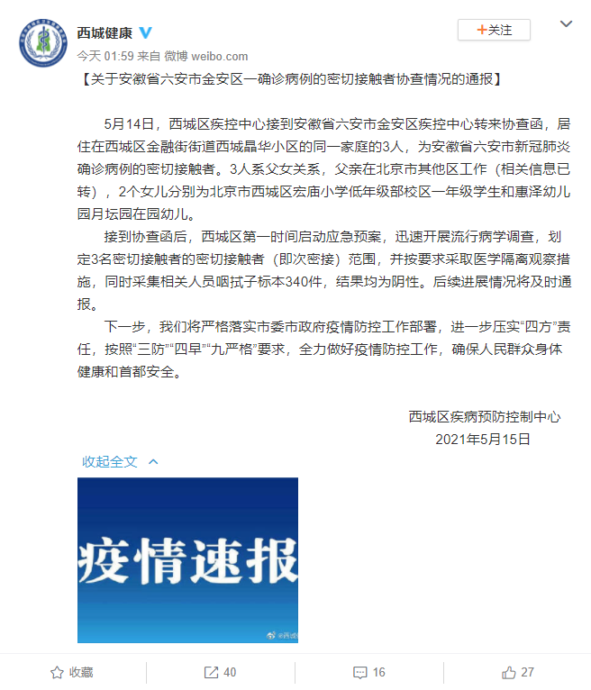 5月14日,西城区疾控中心接到安徽省六安市金安区疾控中心转来协查函,居住在西城区金融街街道西城晶华小区的同一家庭的3人,为安徽省六安市新冠肺炎确诊病例的密切接触者。3人系父女关系,父亲在北京市其他区工作(相关信息已转),2个女儿分别为北京市西城区宏庙小学低年级部校区一年级学生和惠泽幼儿园月坛园在园幼儿。