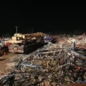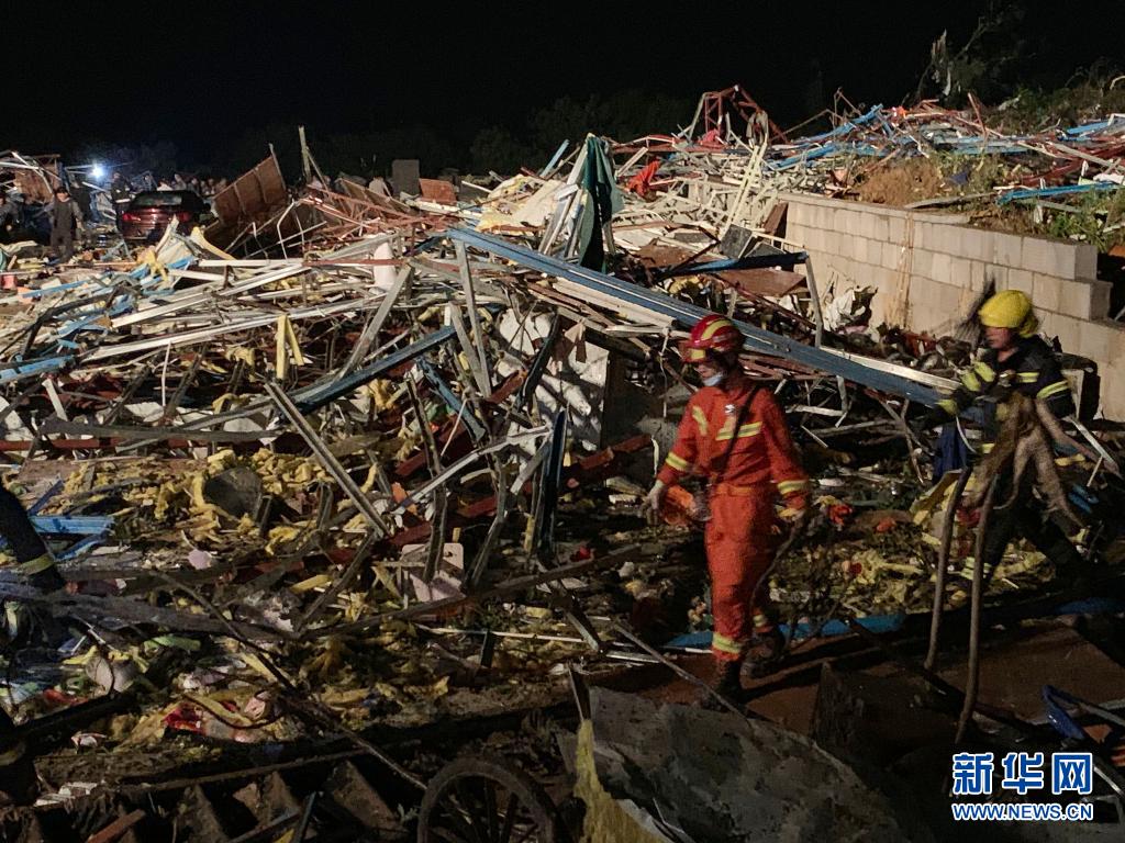 5月15日,武汉消防救援支队的队员在武汉市蔡甸区一处被龙卷风刮倒的厂房内搜救(手机拍摄)。新华社记者 熊琦 摄