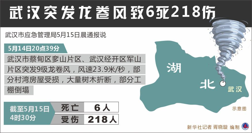 新华社武汉5月15日电(记者熊琦)武汉市应急管理局15日晨通报说,14日20点39分,武汉市蔡甸区奓山片区、武汉经开区军山片区突发9级龙卷风,风速23.9米/秒,部分村湾房屋受损,大量树木折断,部分工棚倒塌。截至15日4时30分,因灾不幸死亡6人,受伤218人;倒塌民房27户85间,损坏民房130户400间、塔吊2座、临时工棚8000平方米。