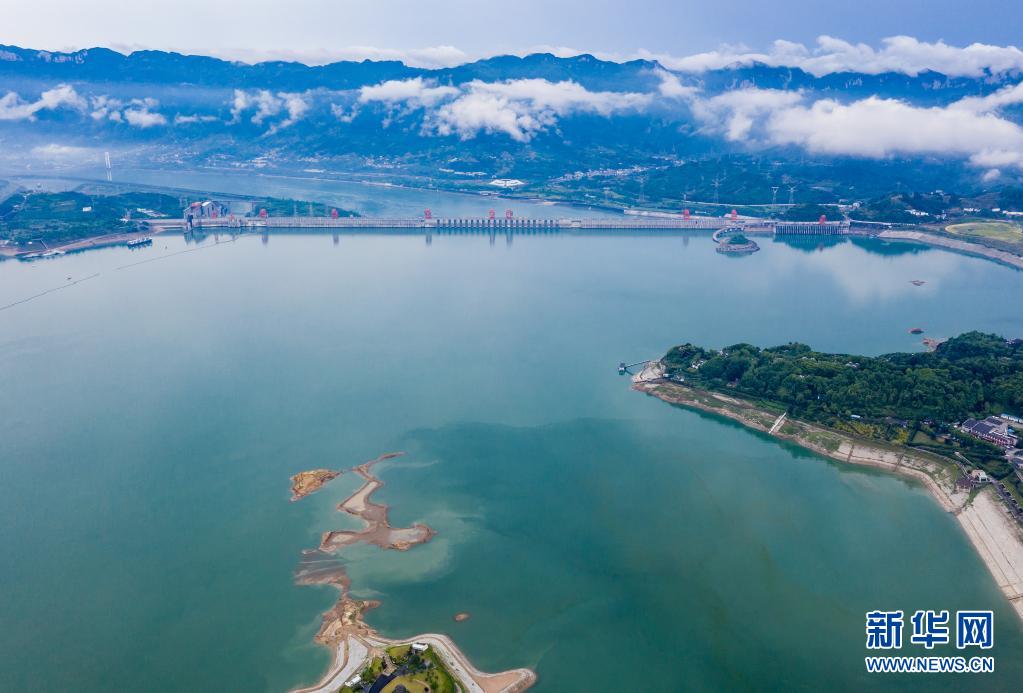 5月15日拍摄的三峡大坝。大坝上游湖北省宜昌市秭归县木鱼岛公园库岸水位下降后消落带清晰可见(无人机照片)。