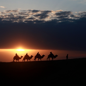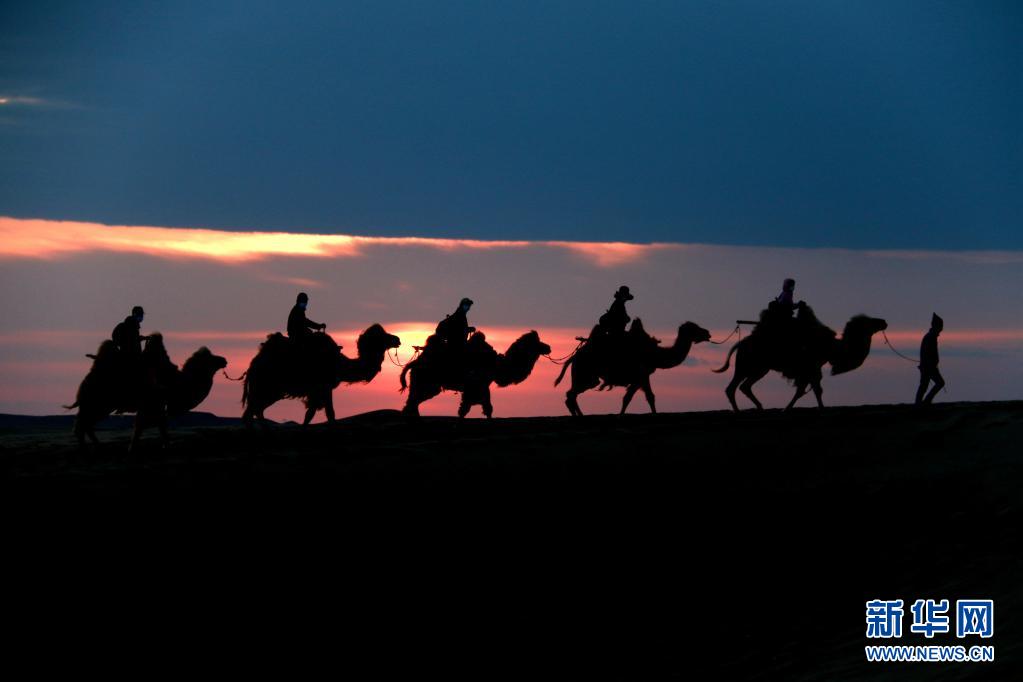 5月15日,游客骑骆驼在甘肃省敦煌市鸣沙山月牙泉景区游览。晨光下,云彩、沙山、驼队构成了一幅美丽迷人的画卷。新华社发(张晓亮 摄)