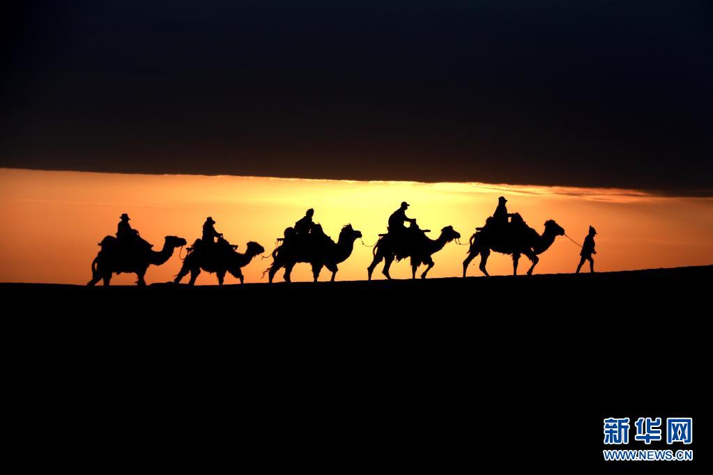 5月15日,游客骑骆驼在甘肃省敦煌市鸣沙山月牙泉景区游览。晨光下,云彩、沙山、驼队构成了一幅美丽迷人的画卷。新华社发(张晓亮 摄)