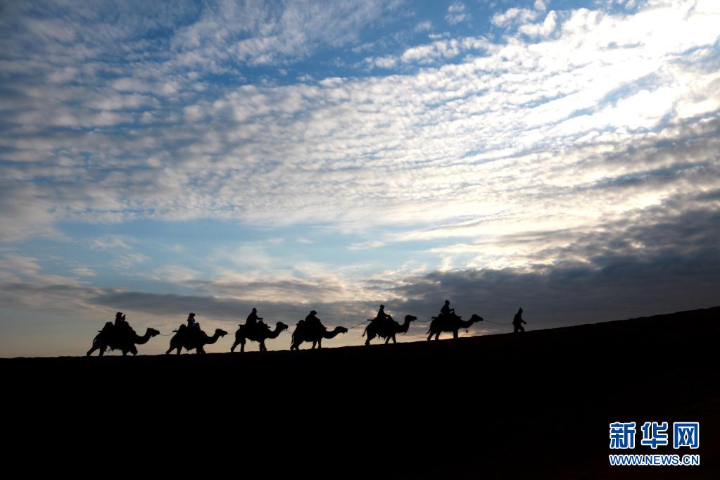 5月15日,游客骑骆驼在甘肃省敦煌市鸣沙山月牙泉景区游览。晨光下,云彩、沙山、驼队构成了一幅美丽迷人的画卷。新华社发(张晓亮 摄)