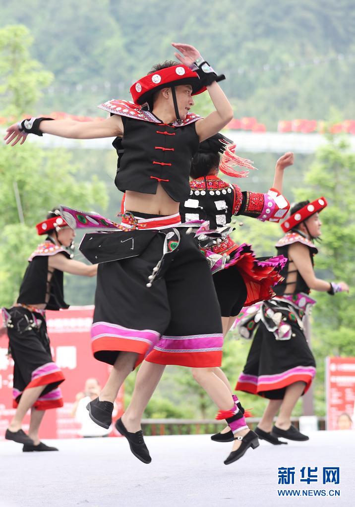 5月16日,演员在丹寨县万达小镇非遗歌舞展演活动上表演苗族木鼓舞。