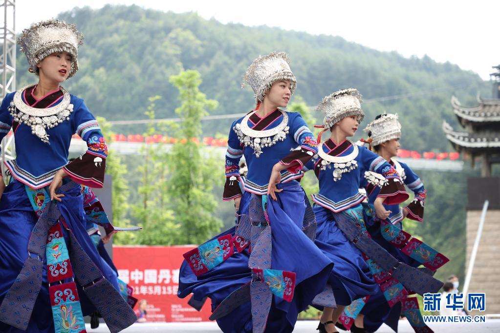 5月16日,演员在丹寨县万达小镇非遗歌舞展演活动上表演苗族踩鼓舞。