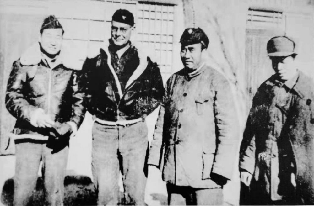 毛泽东、朱德与美军观察组组长包瑞德上校在延安机场。(资料照片)
