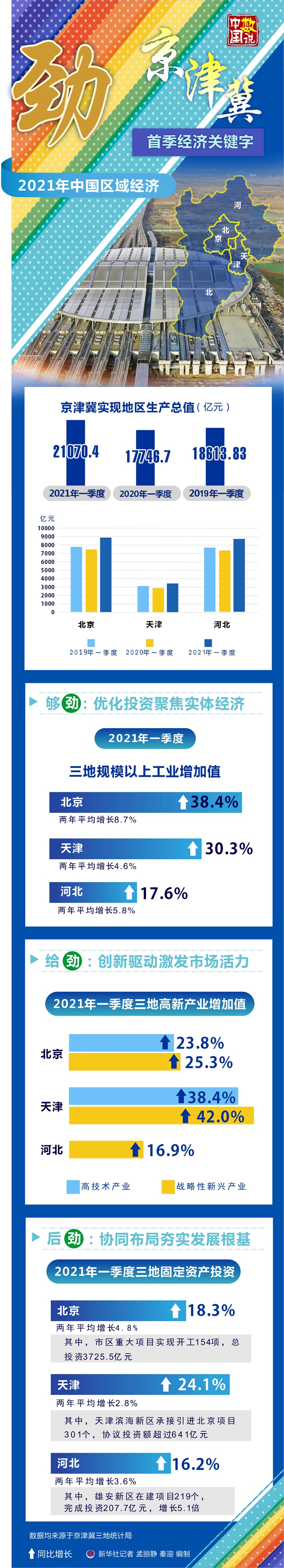 今年一季度,北京、天津、河北地区生产总值同比分别增长17.1%、15.9%、15.1%,实现稳健开局,三地携手在优化投资、激活市场、协同布局方面施策施力,推动京津冀协同发展战略向纵深推进,夯实经济可持续发展后劲。
