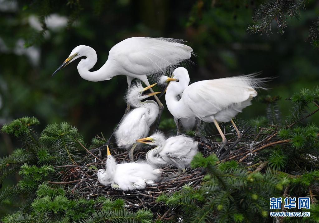 在南昌市新建区象山森林公园内,白鹭在给雏鸟喂食(5月18日摄)。