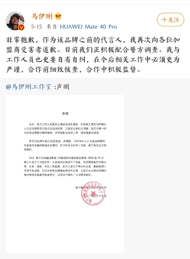 根据上海警方披露的“套路加盟”相关案情,犯罪嫌疑人通过收购或注册“茶芝兰”等50余个奶茶品牌,以虚假宣传对外推销加盟服务,伺机实施合同诈骗。目前,这一案件抓获犯罪嫌疑人90余名,涉案金额逾7亿元。随后,作为“茶芝兰”品牌代言人的马伊琍,通过其个人及工作室社交网络平台发表致歉声明,并向受骗消费者、加盟商致以歉意。