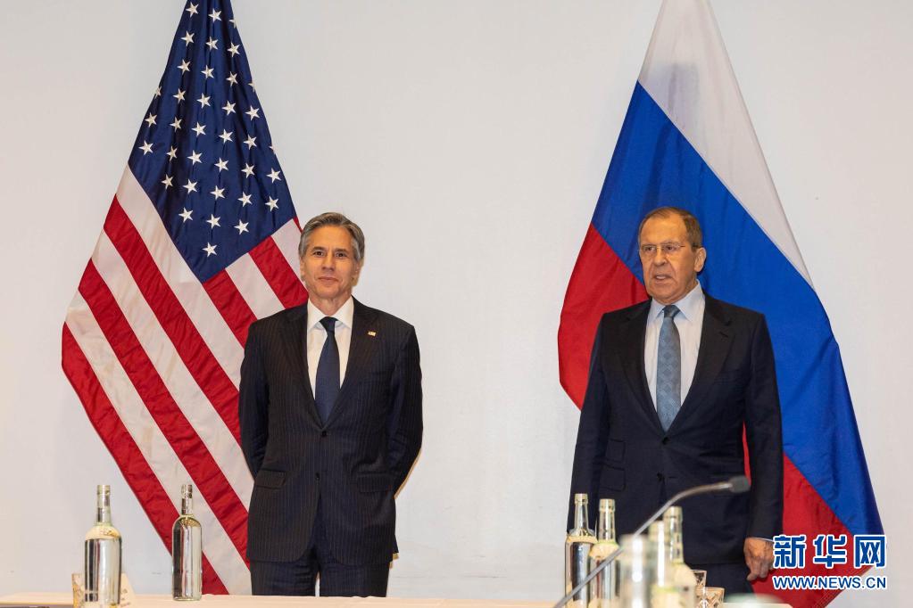 5月19日,美国国务卿布林肯(左)和俄罗斯外长拉夫罗夫在冰岛雷克雅未克举行会晤。新华社发(冰岛外交部供图)