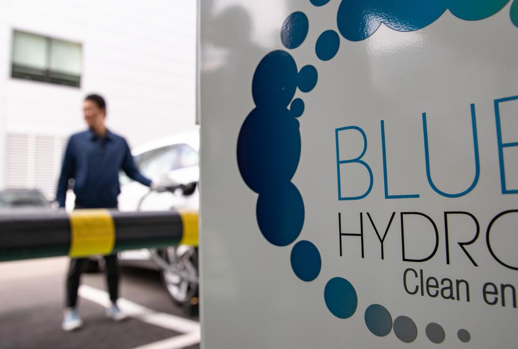 2019年10月22日,在韩国龙仁市现代起亚汽车环境技术研究所,一名工作人员展示如何向一辆氢燃料电池车加氢。(新华社记者王婧嫱摄)