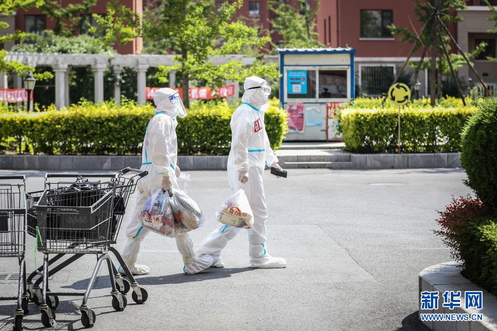 5月19日,工作人员为辽宁省营口市鲅鱼圈区熊岳镇辽海花园小区的居民运送生活用品。新华社记者 潘昱龙 摄