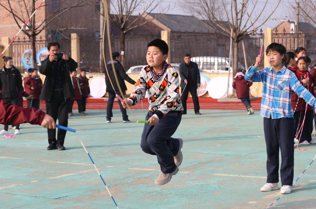 2021年3月10日,江苏省睢宁县骑路小学的学生们在练习“交互绳中360度转体跳” 。新华社记者 杨磊 摄