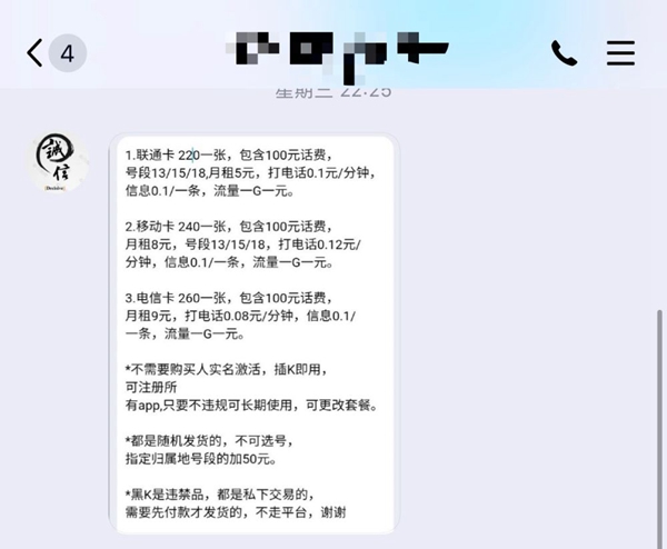 说明目的后,对方发来一张“价目表”,三大运营商电话卡每张收费220元至260元不等,包含100元话费,并特别标注“不需要购买人实名激活,插卡即用,可注册所有App,只要不违规可长期使用,随机发货。黑卡属于违禁品,都是私下交易,需要先付款才发货,不走平台”。