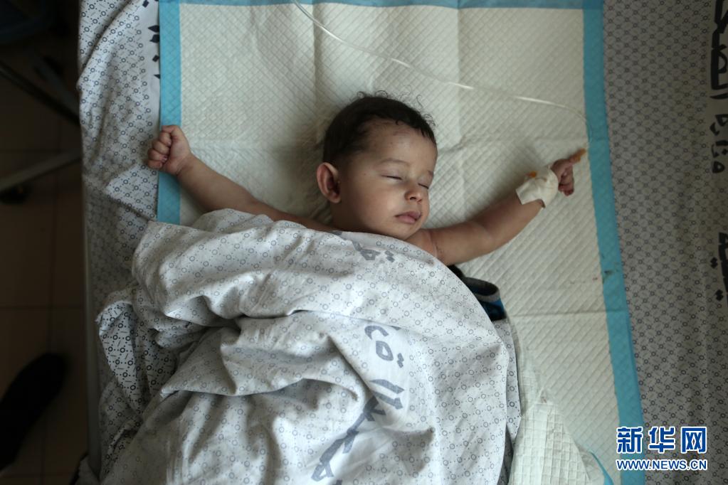 5月20日,一名因空袭受伤的巴勒斯坦儿童在加沙地带城市汗尤尼斯的医院中接受治疗。
