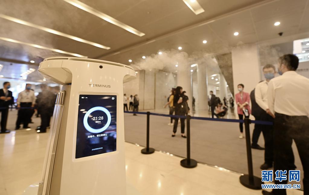 5月20日,在天津梅江会展中心,消毒机器人在世界智能大会会场工作。新华社记者 李然 摄