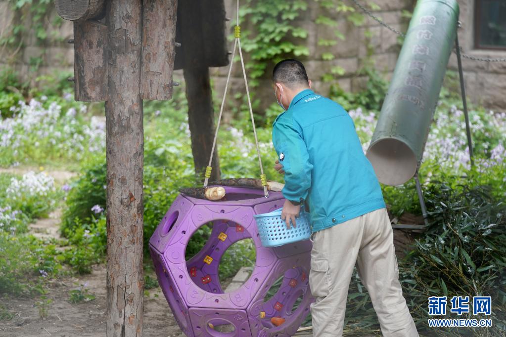 在北京动物园大熊猫馆的户外运动场,马涛在为大熊猫“萌萌”放置食物(4月21日摄)。新华社记者 鞠焕宗 摄
