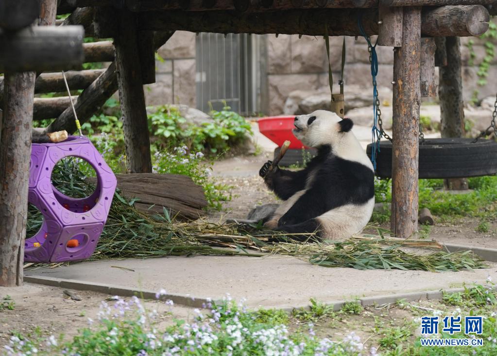 在北京动物园大熊猫馆,大熊猫“萌萌”在户外运动场进食(4月21日摄)。新华社记者 鞠焕宗 摄