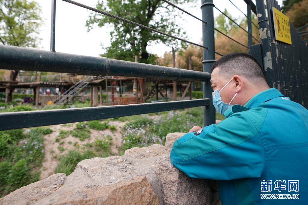 在北京动物园大熊猫馆,马涛在观察大熊猫“萌萌”的进食情况(4月21日摄)。新华社记者 鞠焕宗 摄