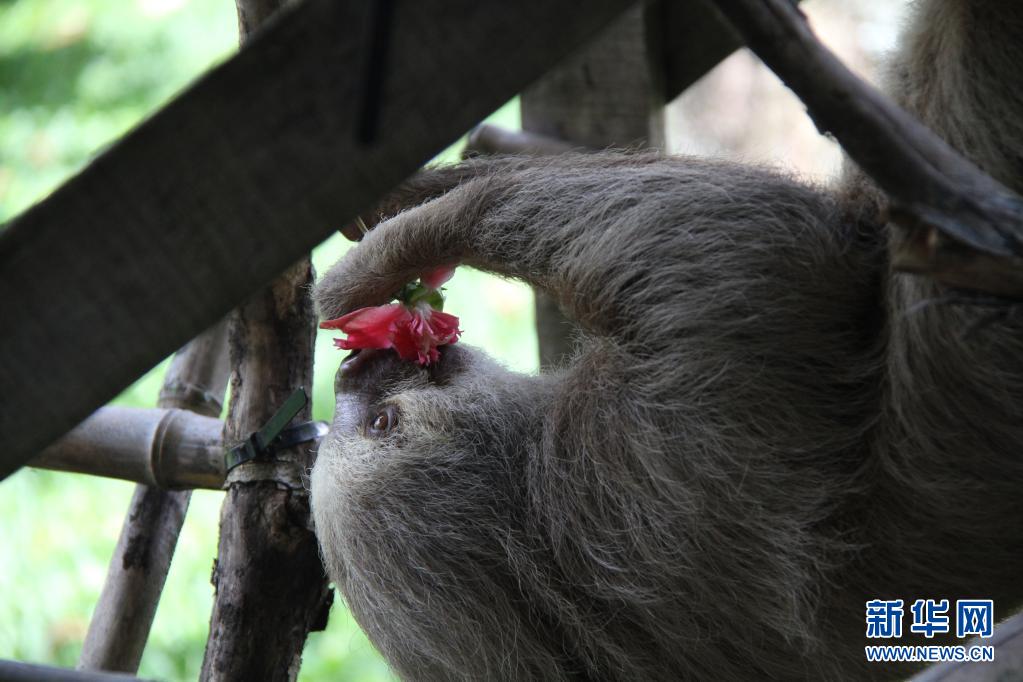 4月20日,树懒“拉蒂”在位于哥斯达黎加埃雷迪亚的“巨嘴鸟救助牧场”享用它的“鲜花早餐”。新华社记者 范小林 摄