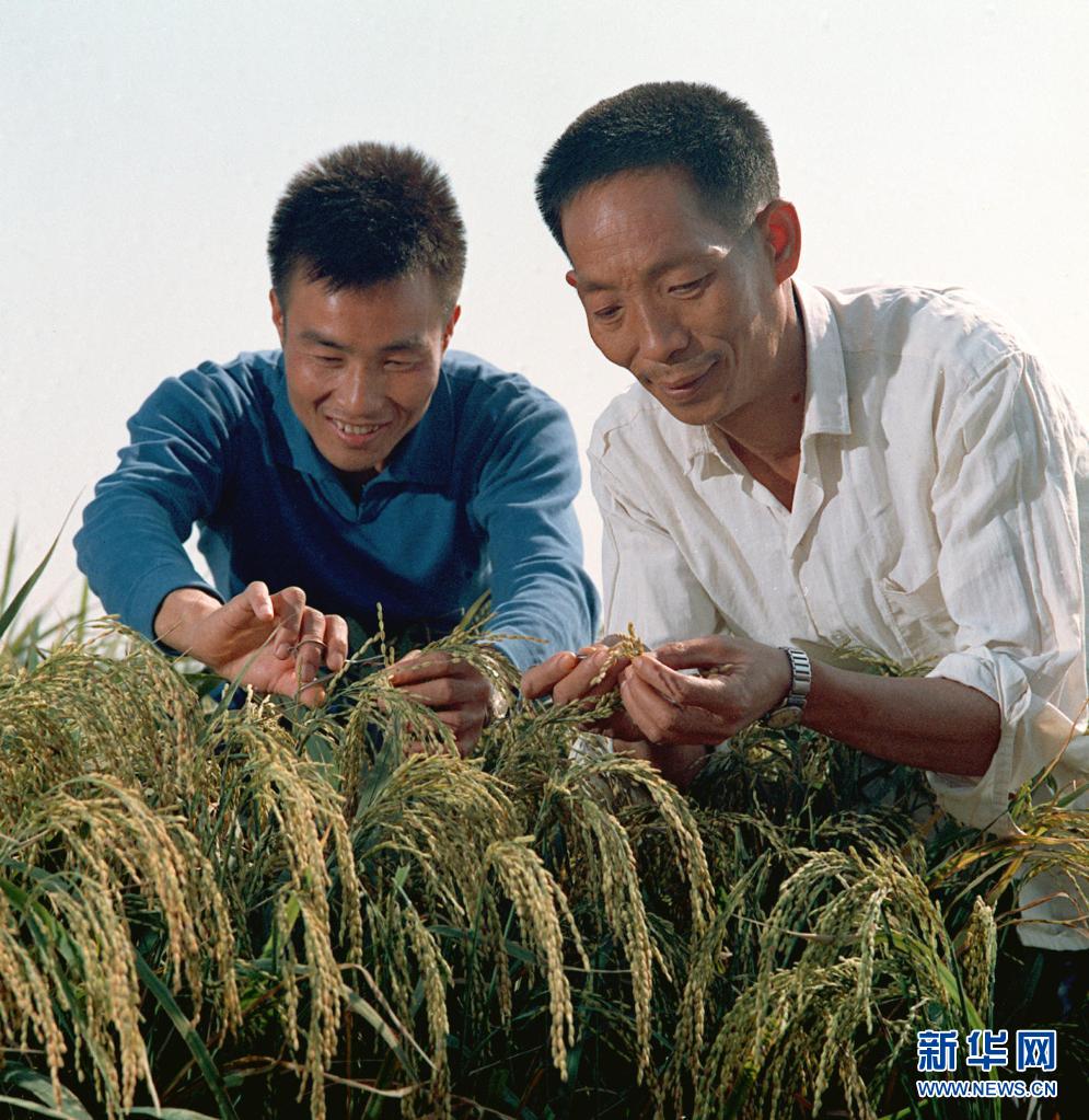 这是1976年,袁隆平(右)与同事李必湖在观察杂交水稻生长情况。新华社发